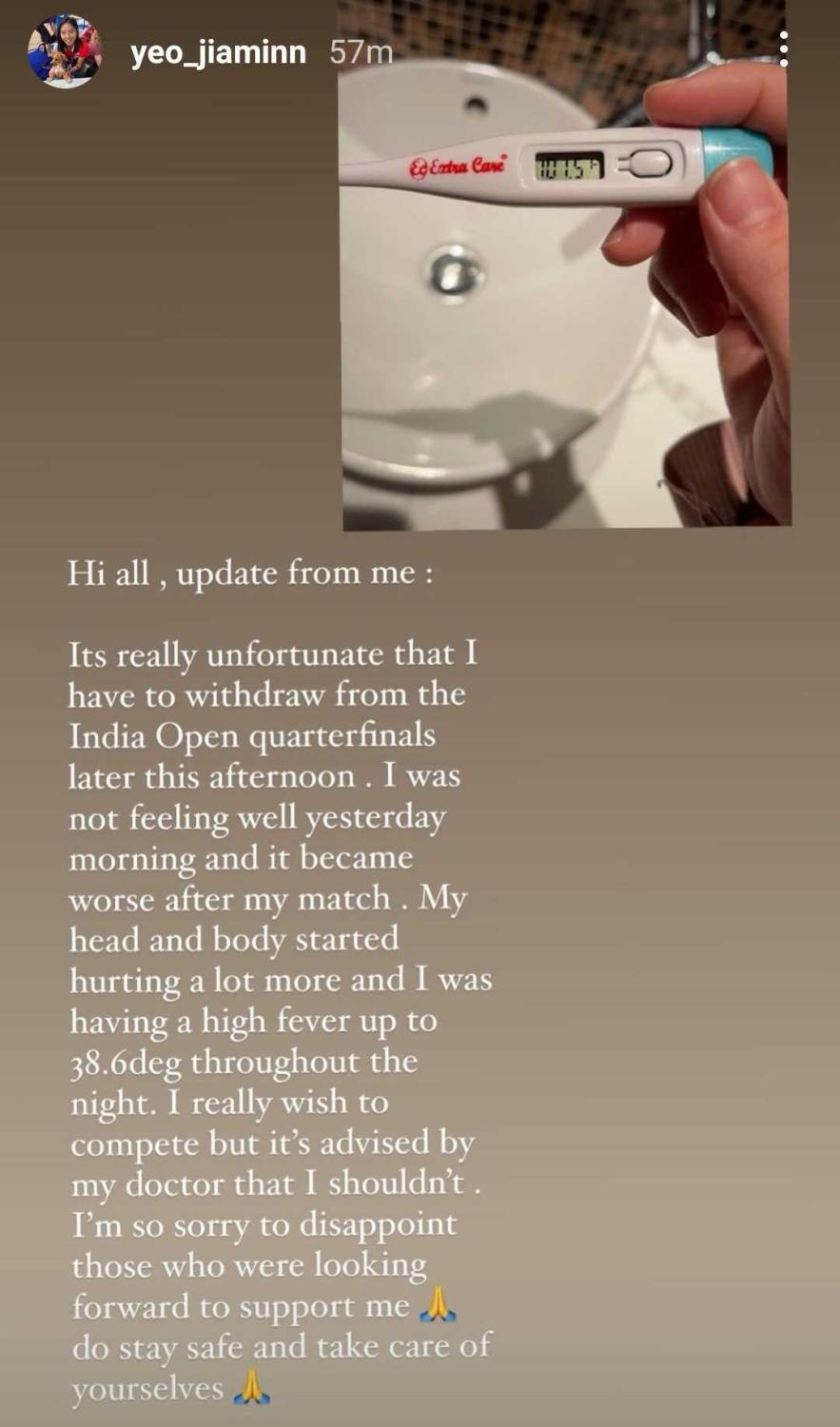 “It's really unfortunate that I have to withdraw from the India Open quarterfinals later this afternoon,” Yeo wrote in an Instagram story.