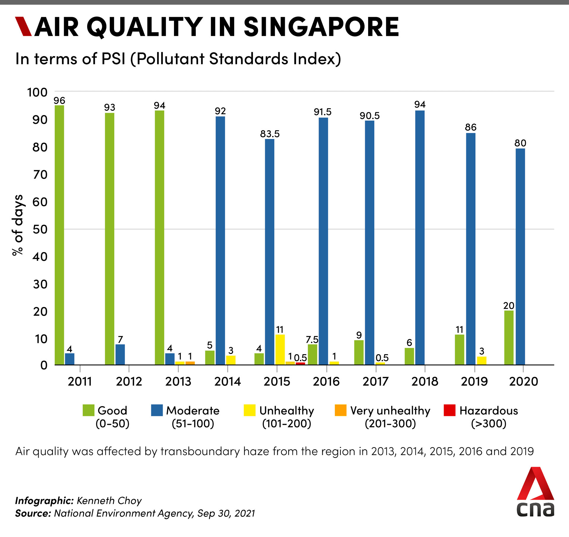 The air quality in Singapore was in the Good to Moderate range on all days of 2020, according to the inaugural State of the Environment: Air and Water Quality Report published by the National Environment Agency (NEA).