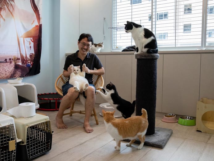 The 39-year-old cat owner, who wanted to remain anonymous as owning a cat in a Housing and Development Board (HDB) flat is currently illegal, works part-time as a delivery attendant in the day and is a bouncer at night, leaving him with little free time.