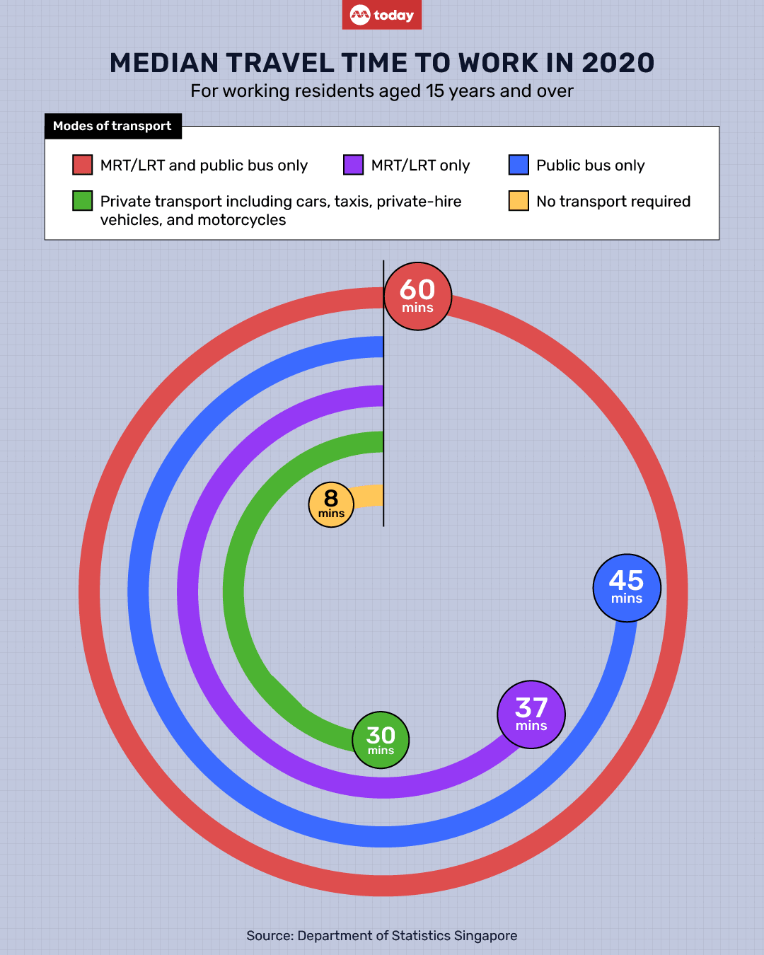 In 2020, the Department of Statistics reported that the median travel time for residents commuting to work via MRT/LRT and public bus was 60 minutes.