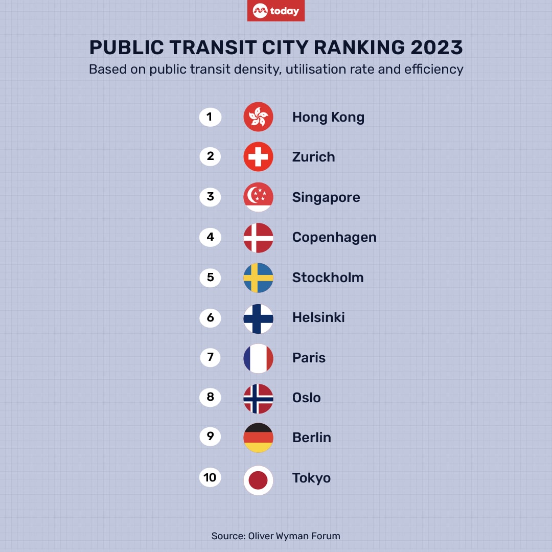 According to the Urban Mobility Index Ranking 2023 by American consulting firm Oliver Wyman Forum, Singapore ranked third place for public transit, with Hong Kong, and Zurich in Switzerland, coming in first and second, respectively.