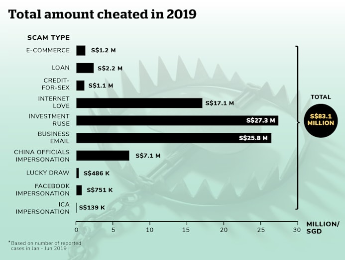 The numbers are staggering. For the top 10 types of scams from January to June this year, 3,591 cases were reported with a total loss of S$83.1 million. The largest sum cheated in a single case this year was S$4.3 million, via an investment ruse.