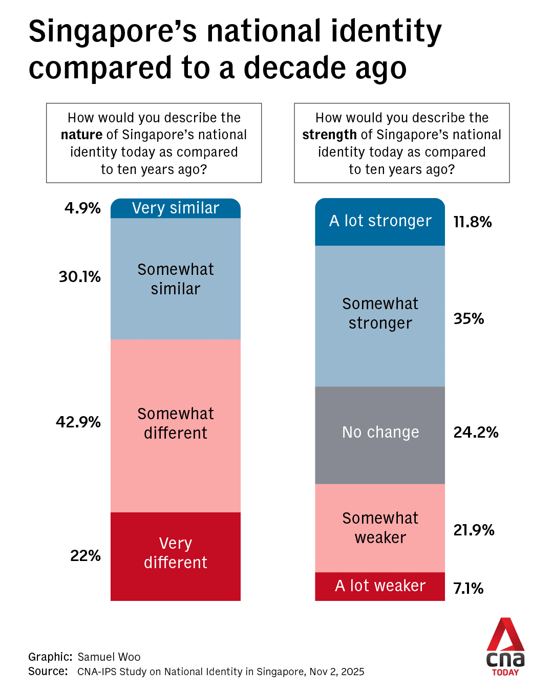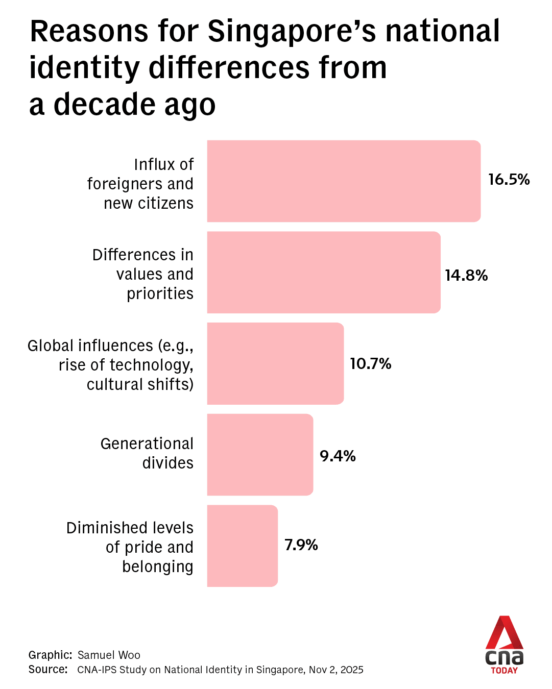 The CNA-IPS study found that 14.8 per cent of respondents felt that differences in values and priorities have caused Singapore's national identity to shift, while 10.7 per cent cited global influences like cultural shifts and technology.