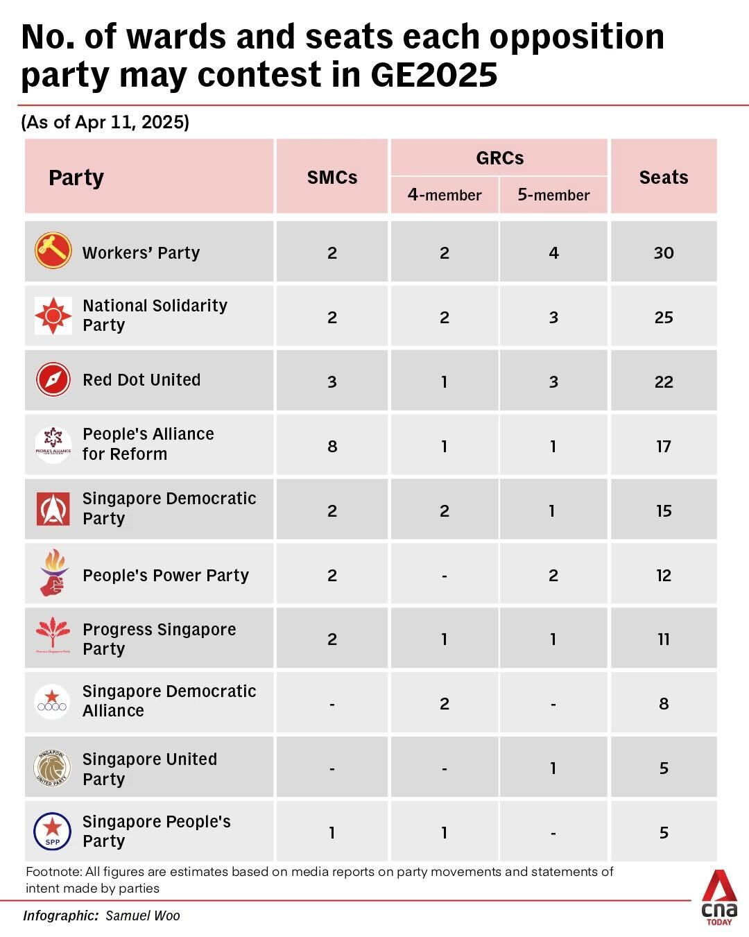 Based on media reports on party movements and statements of intent made by parties themselves, as of April 11, as many as 13 of these – eight Group Representation Constituencies (GRCs) and five Single Member Constituencies (SMCs) – could see a three-cornered fight in the upcoming election.