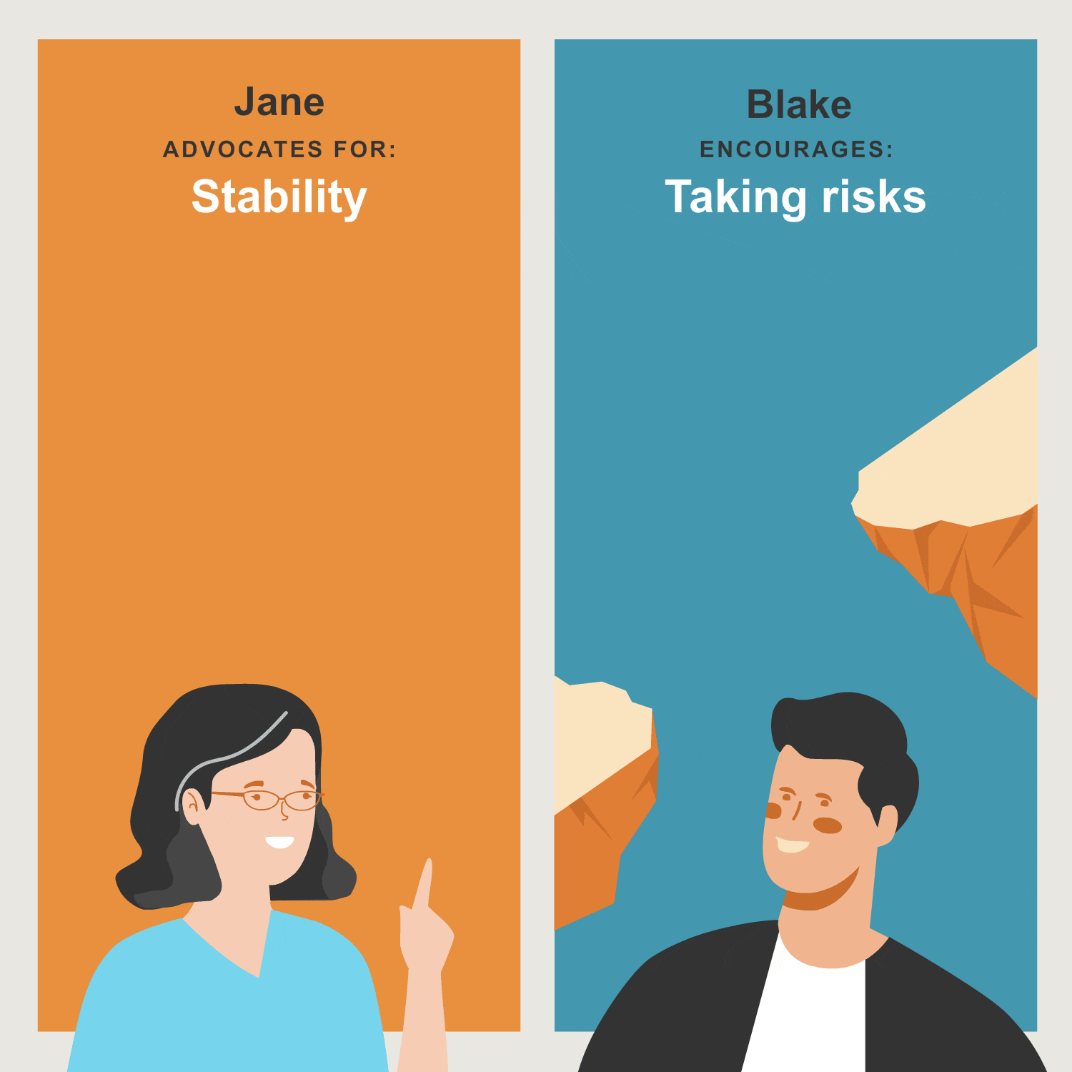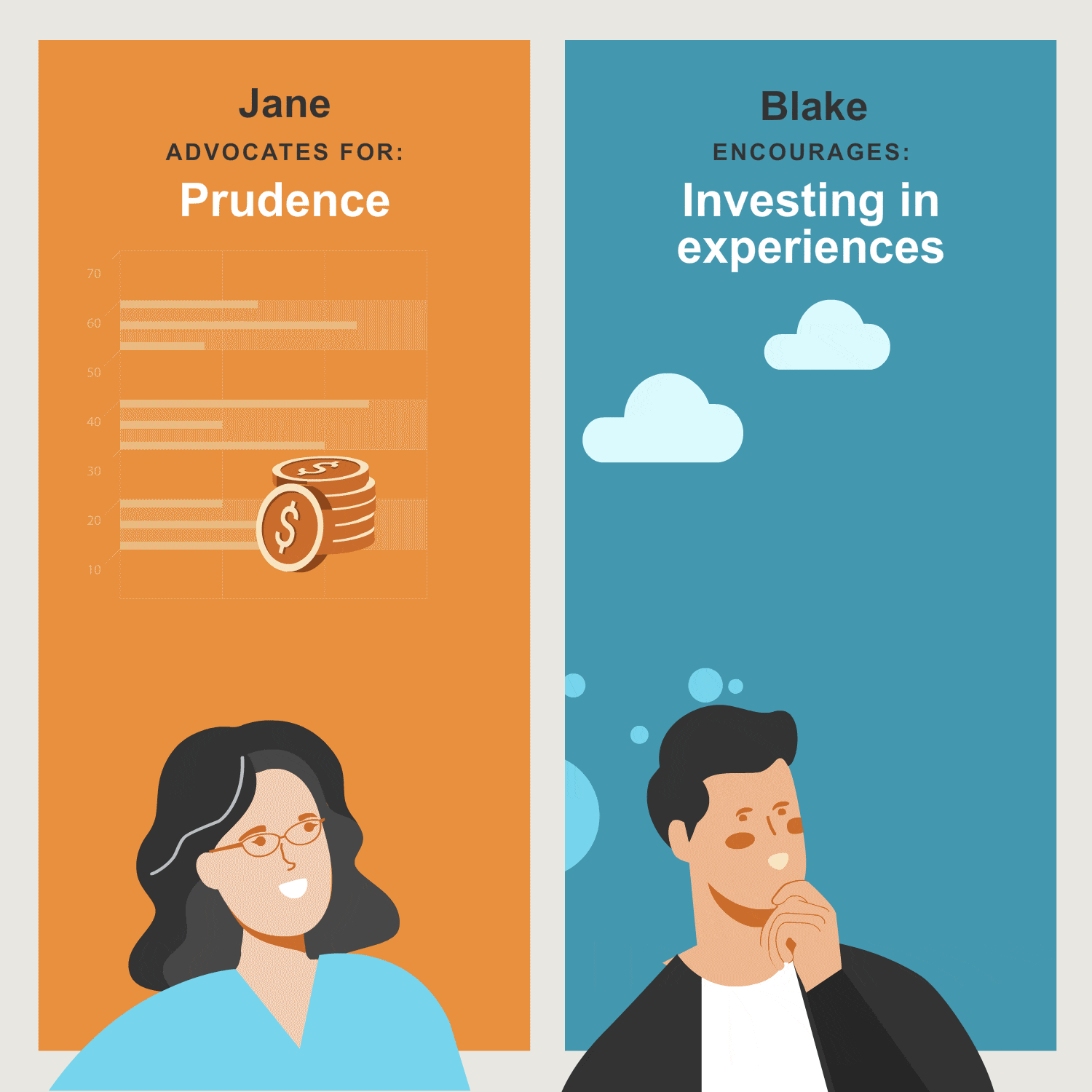 While Josh feels that Blake is better informed about today’s economic opportunities and risks, he also knows that Jane’s pragmatism stems from years of experience in the workforce and genuine concern for his future.