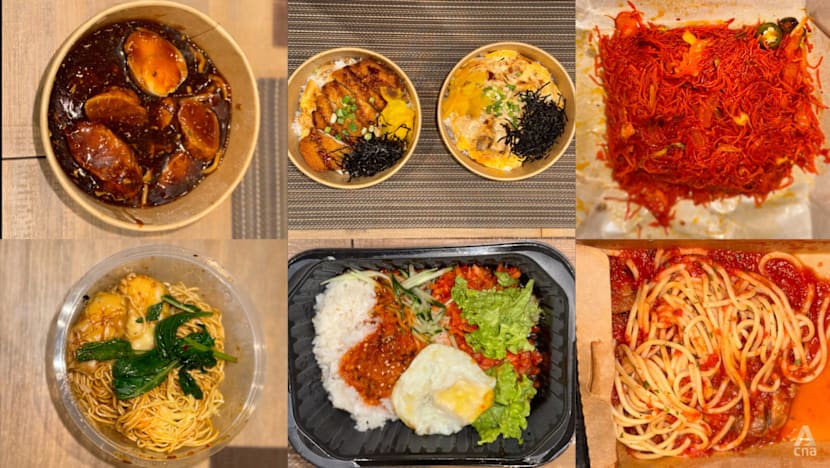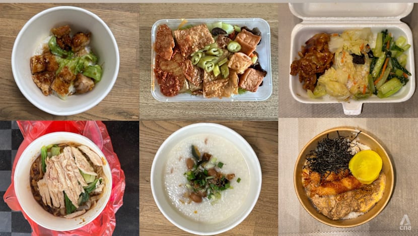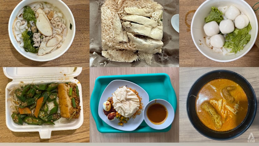 Six of the 40 budget meals from across Singapore that CNA TODAY ate in October 2025. (Photo: CNA/Loraine Lee, CNA/Deborah Ng)