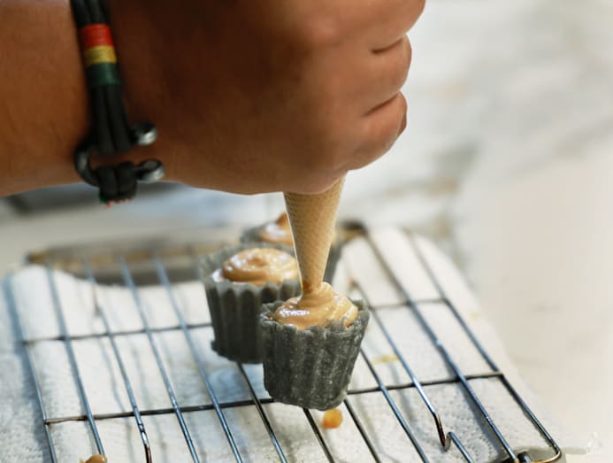 On a recent afternoon, my colleague and I watched as the 41-year-old blended onions with cream and soy sauce to make a savoury glaze, paired it with a confit egg yolk, and finished the dish with homemade soy sauce "caviar" and a sprinkling of lime leaf powder. All of this was served in a charcoal kueh pie tee shell made by himself.