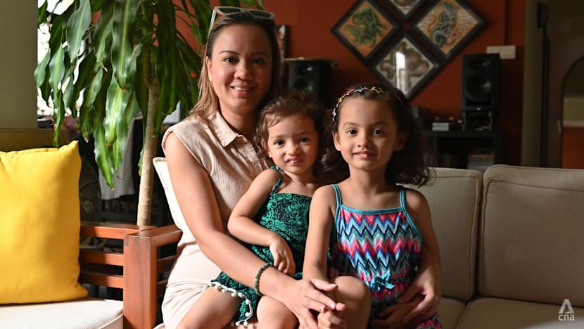 Ms Jillian Lim with her two daughters at a neighbourhood food centre on Jan 23, 2026. (Photo: CNA/Justin Tan)