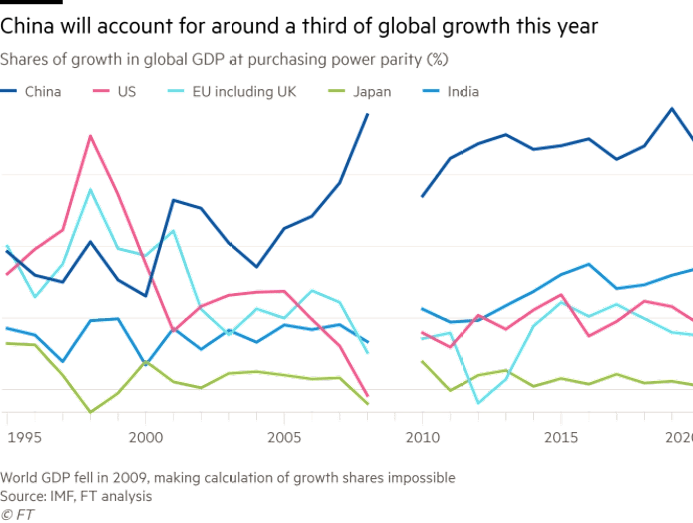 But China’s place in the global economy has grown dramatically over that time. China today accounts for about one-third of global growth, a larger share than the US, Europe and Japan combined.