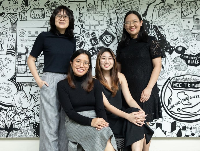 Nanyang Technological University students, (from left to right) Ms Amanda Wong, 24, Ms Sabrina Tang, 25, Ms Hanisah Rashid, 24, and Ms Leah Tee, 23, poses for a photo at the Wee Kim Wee School of Communication and Information, on Jan 25, 2023.