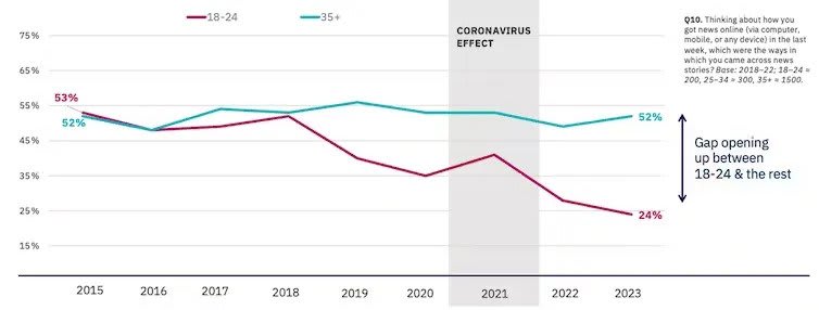 This decline is partly driven by Facebook pulling back from the news and partly by the way that video-based networks such as YouTube and TikTok are capturing much of the attention of younger users.