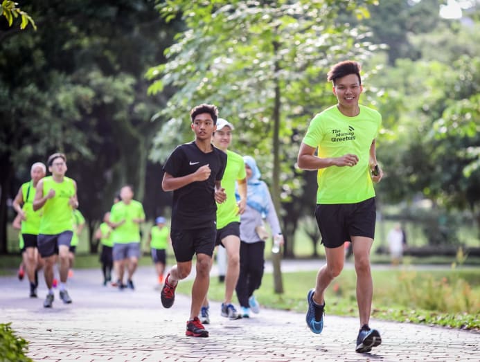 Mr Adrian Phoon (far left) and some members of The Morning Greeters greeting a runner while running at Woodlands Waterfront Park on June 9, 2024.