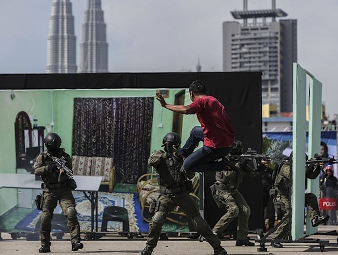Malaysian police taking part in an exercise involving a mock terrorist attack in Kuala Lumpur in March 2018. Photo: Malay Mail