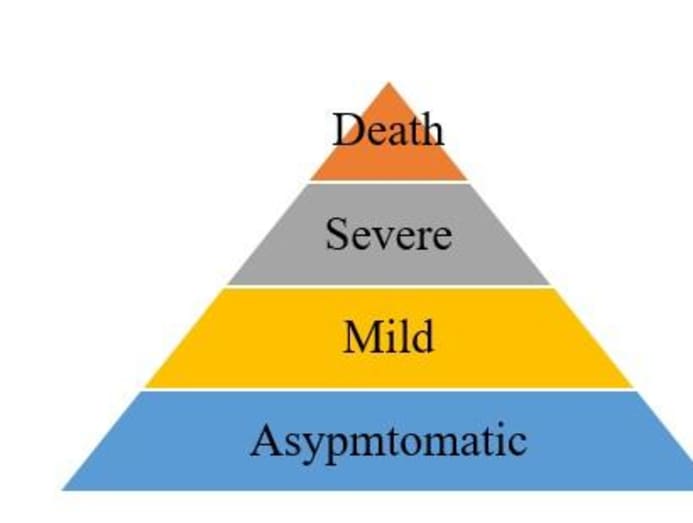 The typical classifications in an epidemic pyramid are death, severe, mild and asymptomatic, as follows: