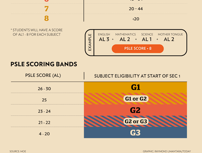 The Ministry of Education (MOE) has said students who score between AL26 and AL30 in the PSLE will be offered the G1 suite of subjects. Those who score between AL4 and AL20 will be offered the highest G3 suite.