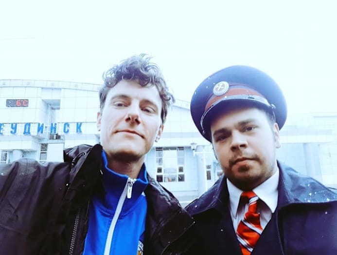 The author (left) meets a train guard in Siberia. Photo: Roger Tyers