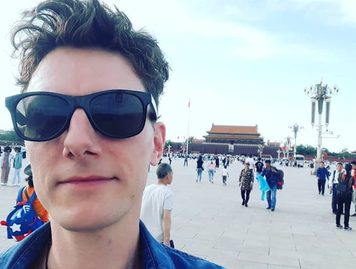 The author at the end of his outward journey in Tiananmen Square, Beijing. Photo: Roger Tyers