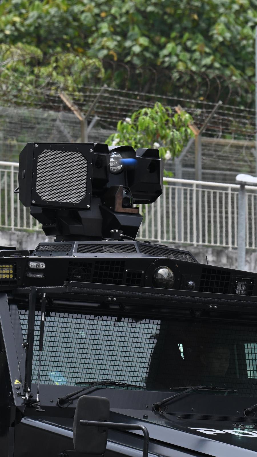 The riot control system gives officers a range of less-lethal options, including a long-range acoustic device and grenade launchers that fire non-lethal munitions.