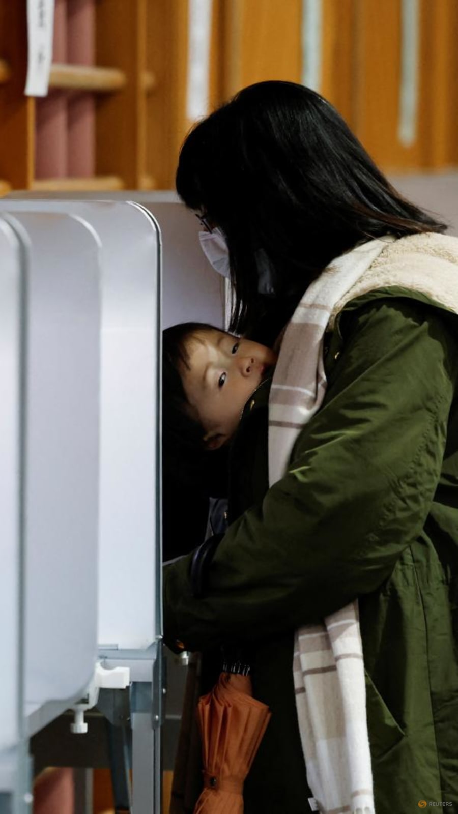 A voter carries a child while casting their ballot for a general election at a polling station in Tokyo.