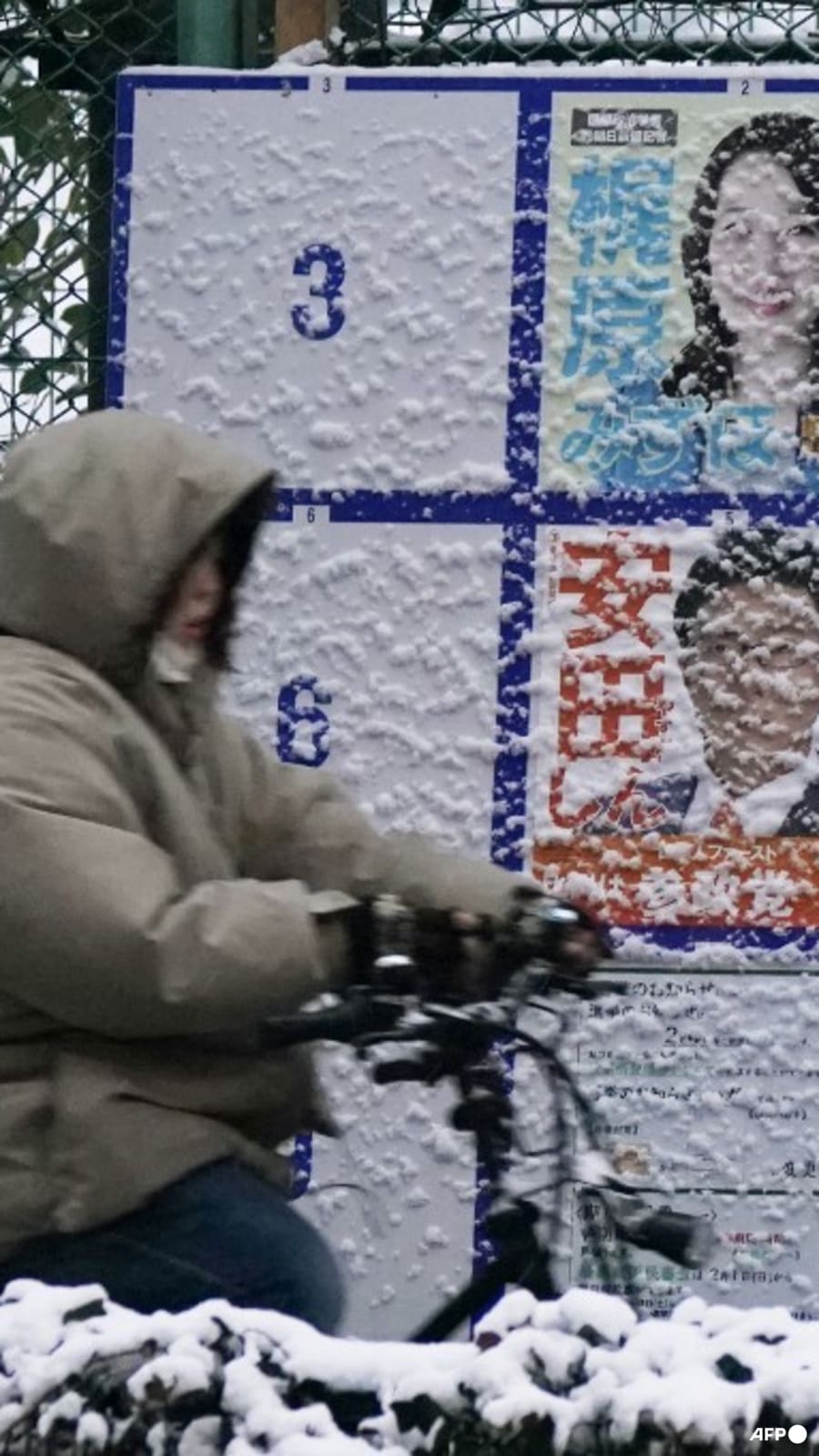 A person rides past a board displaying posters of candidates for the Lower House election, which is being held Feb 8, is seen along the street amidst falling snow in Tokyo.