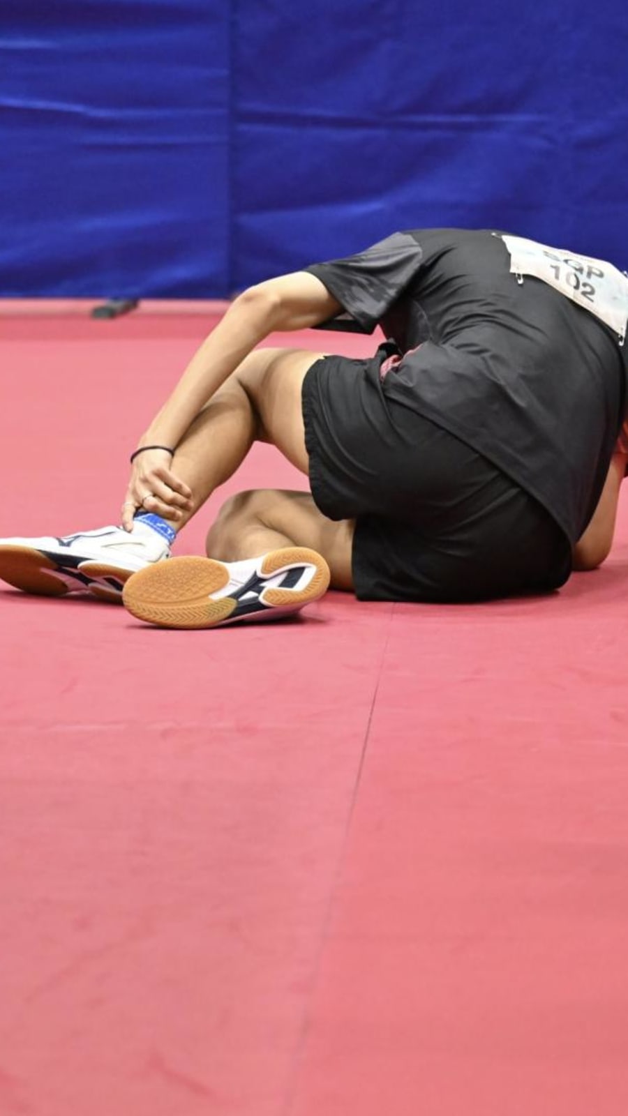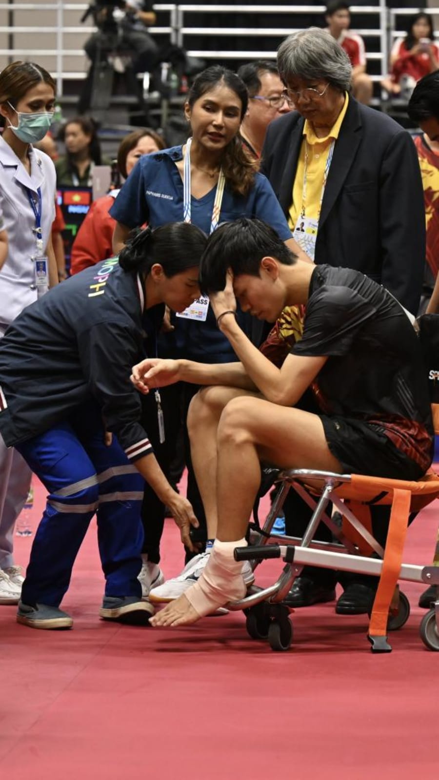 Josh Chua being brought out of the competition arena in a wheelchair.