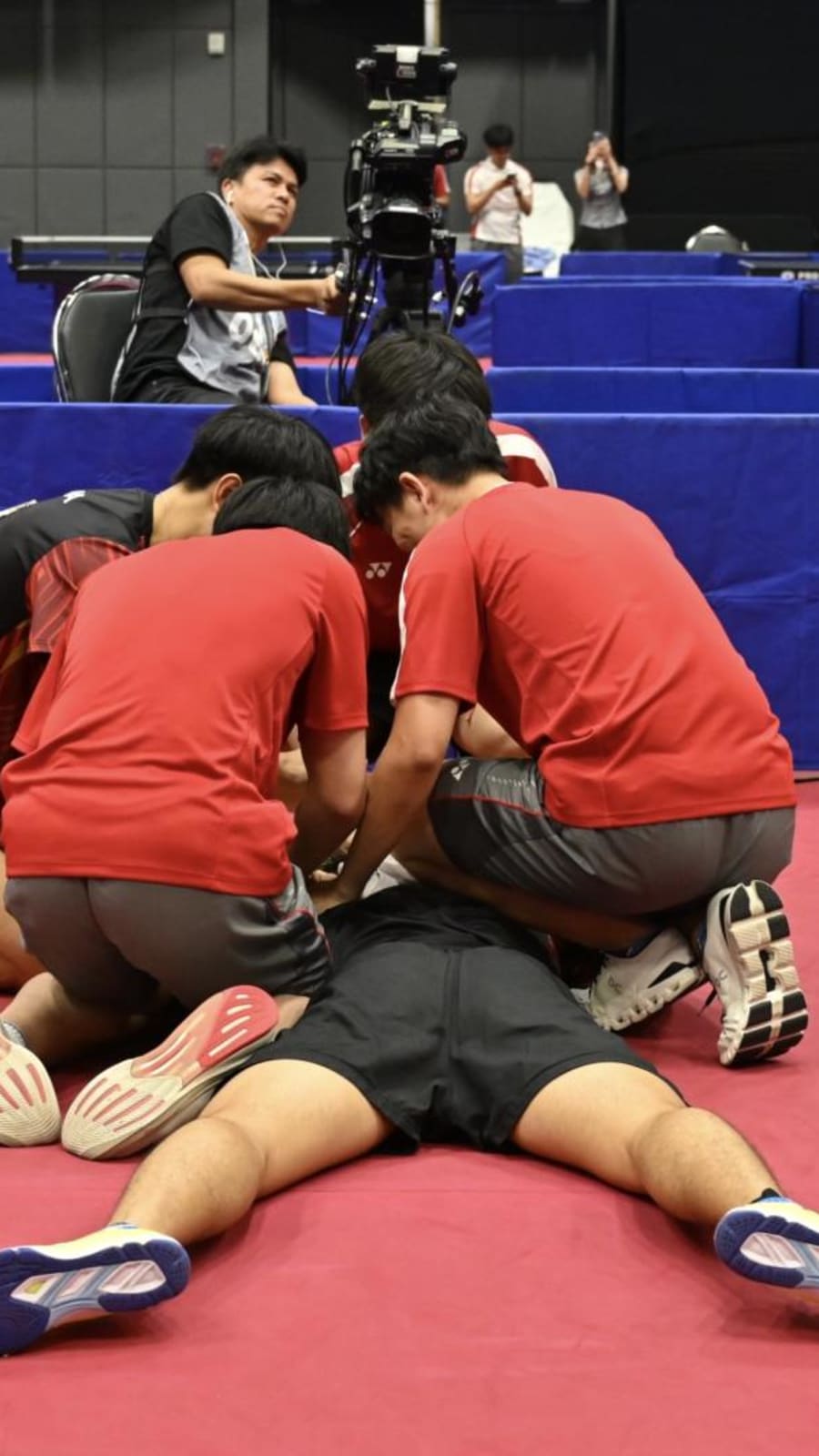 Pang collapsed to the ground as his teammates surrounded him.