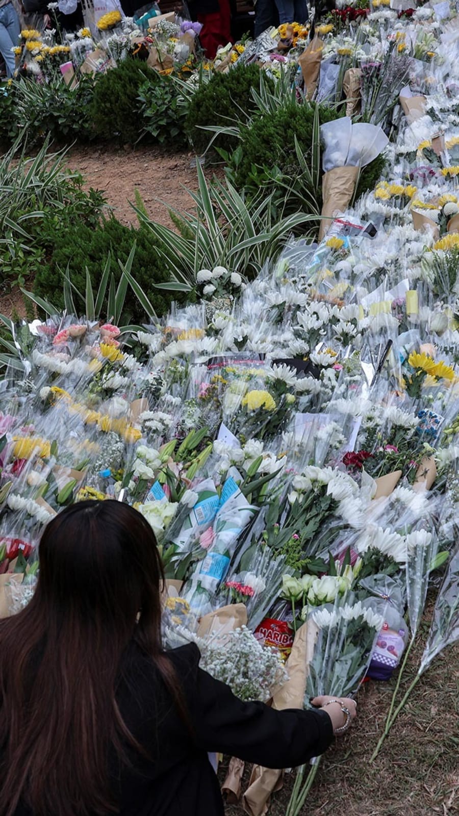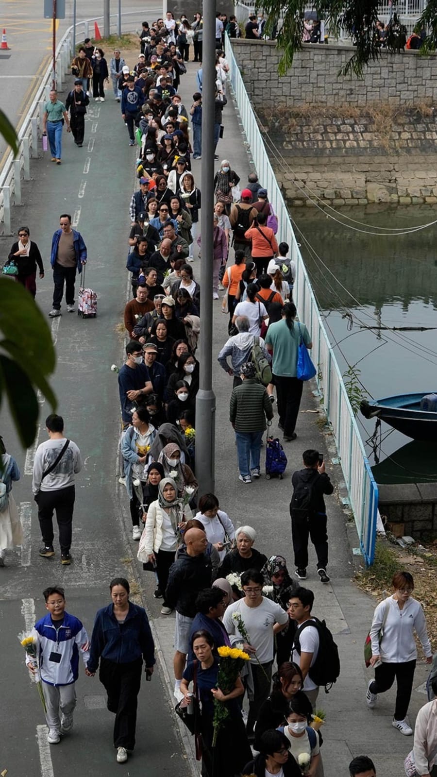Mourners queued for more than a kilometre along the banks of a canal near the burnt-out Wang Fuk Court housing complex.