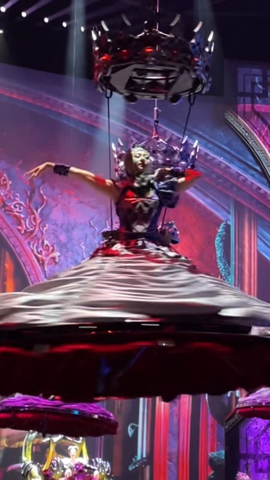 Nine times a week, she is suspended like a human chandelier in a shimmering 15kg skirt and a Swarovski-studded headpiece.