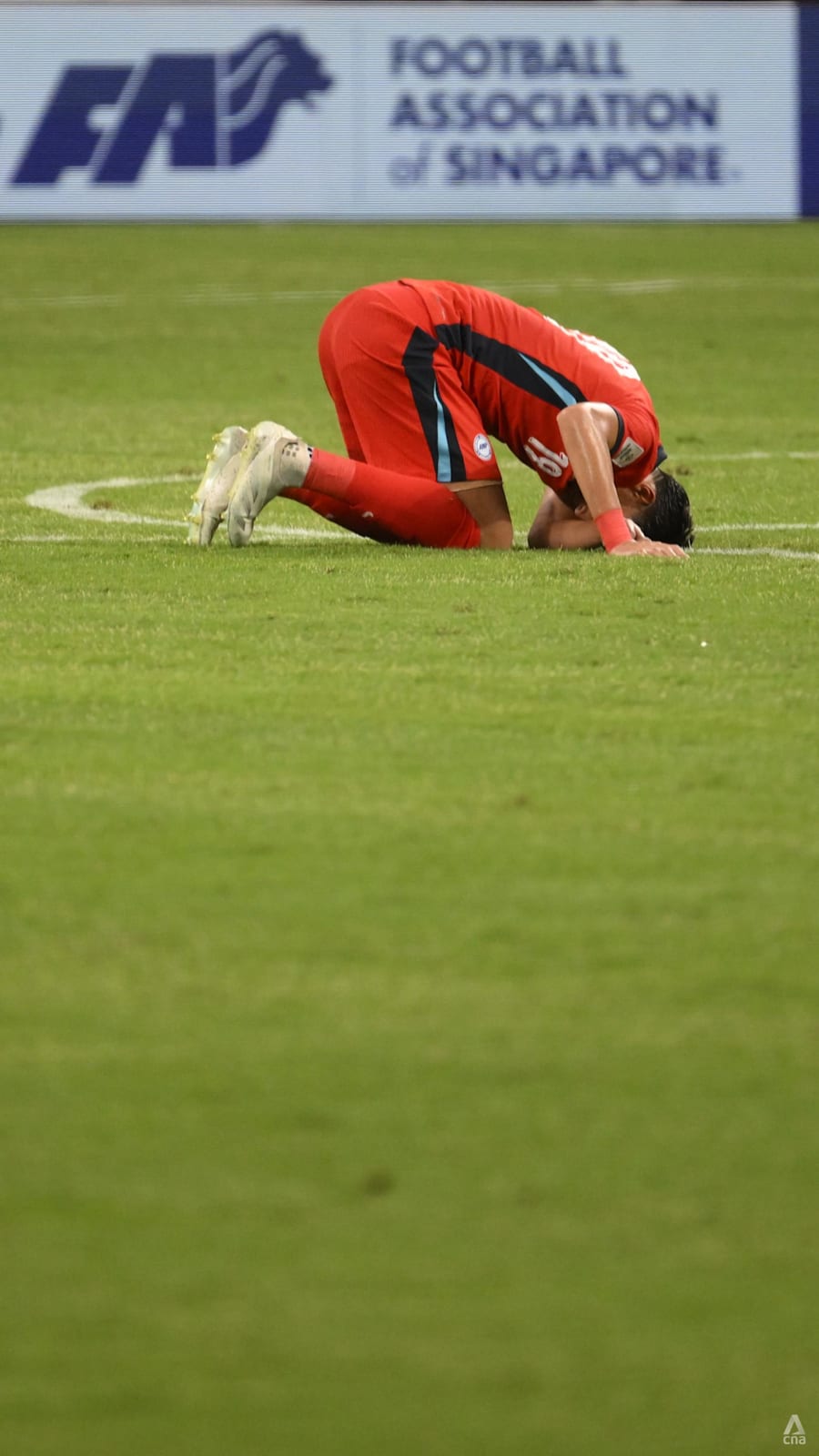 Ikhsan Fandi hunches over at full time having missed several opportunities to extend Singapore's lead.