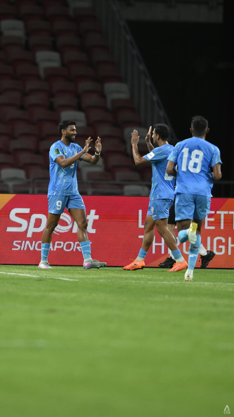 India’s Rahim Ali (left) celebrates with his teammates after scoring an equaliser against Singapore in the 90th minute.