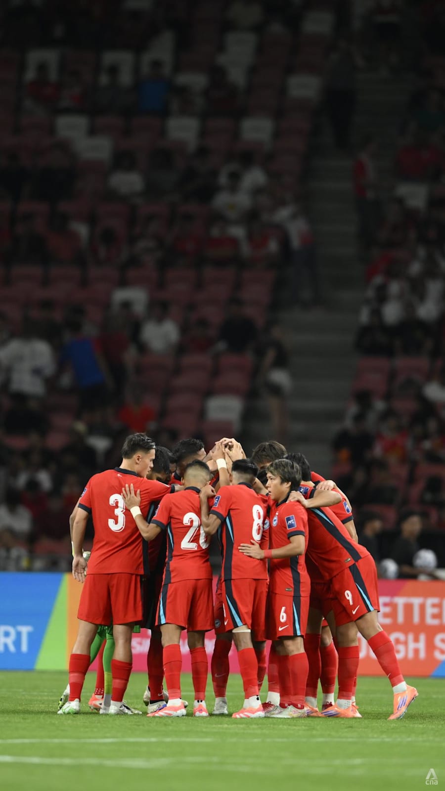 Singapore's players huddle at the start of the match against India.