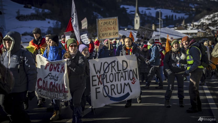 Demonstrators arrive for a protest ahead of the World Economy Forum in Davos, Switzerland, on Jan 19, 2025. (Photo: AP/Markus Schreiber)