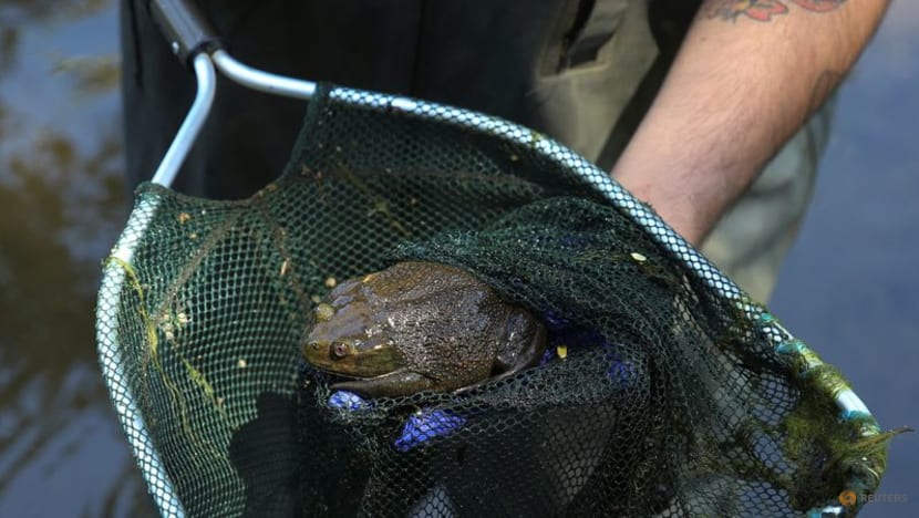 Environmental researchers extract genetic material from a Chilean frog's leg (Calyptocephalella gayi) in a wetland in the middle of a neighbourhood in the city of Quilpue, Chile, Dec 8, 2024. (Photo: Reuters/Rodrigo Garrido)