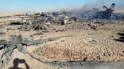 Footage released by Iran's Islamic Revolutionary Guard Corps was presented as showing charred wreckage of an American aircraft scattered across a desert area, with smoke still rising.