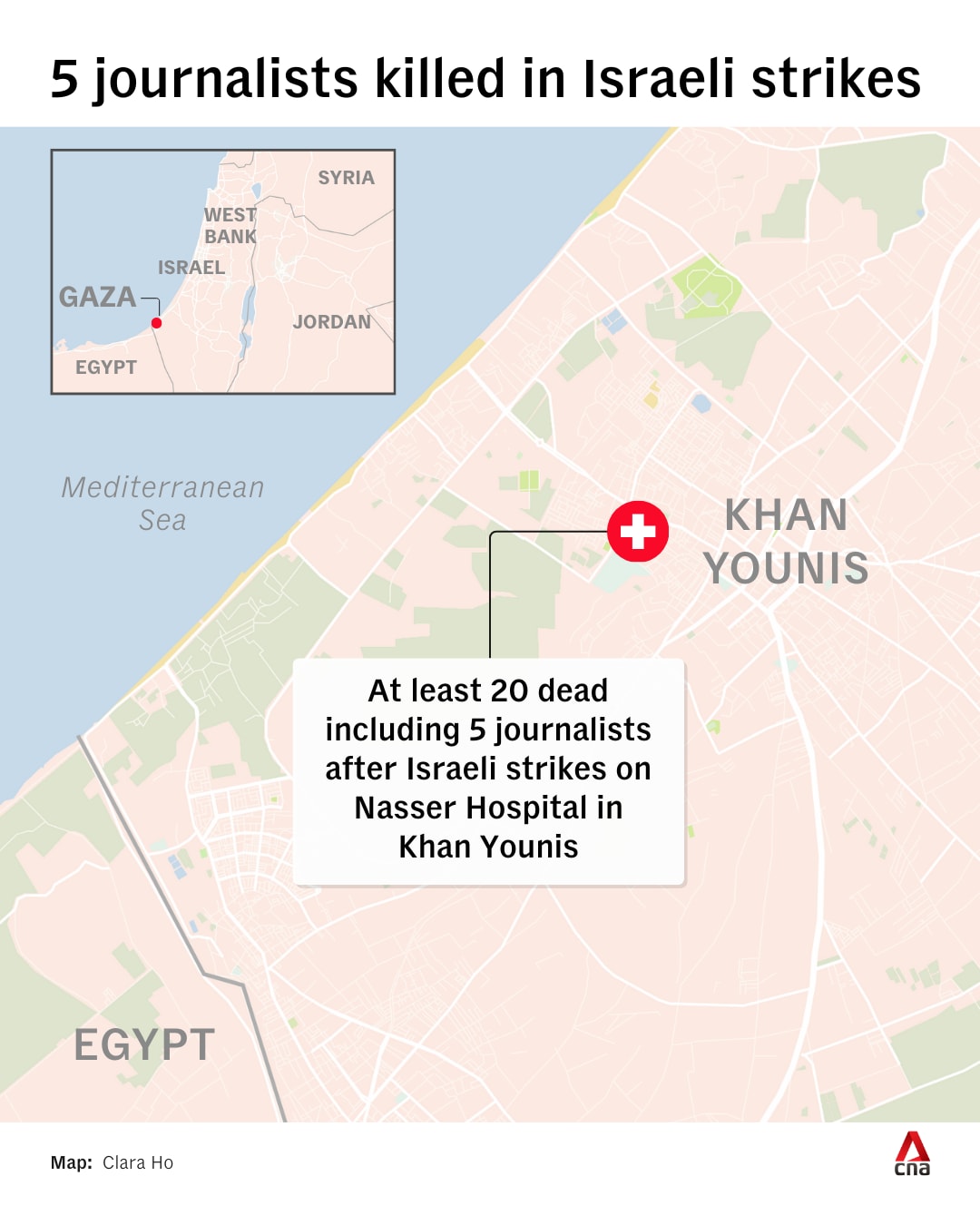 GAZA CITY: Gaza's civil defence agency said five journalists were among at least 20 people killed on Monday (Aug 25) when Israeli strikes hit a hospital in the south, with Israeli Prime Minister Benjamin Netanyahu expressing regret over the "tragic mishap".