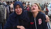 Mourners hug each other during the funeral of Palestinians who, according to medics, were killed in an Israeli strike on Sunday, at Nasser Hospital in Khan Younis, southern Gaza Strip, January 11, 2026. REUTERS/Haseeb Alwazeer