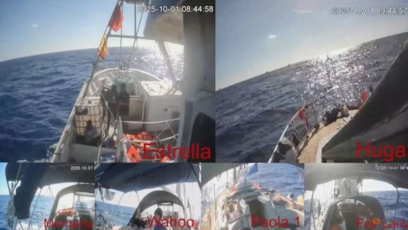 A screengrab from a live footage video shows crew of a Gaza-bound vessel, part of the Global Sumud Flotilla, put their hands up as they are intercepted by Israeli security forces, in this screengrab from a video released on Oct 1, 2025. (Photo: Global Sumud Flotilla/Handout via REUTERS)