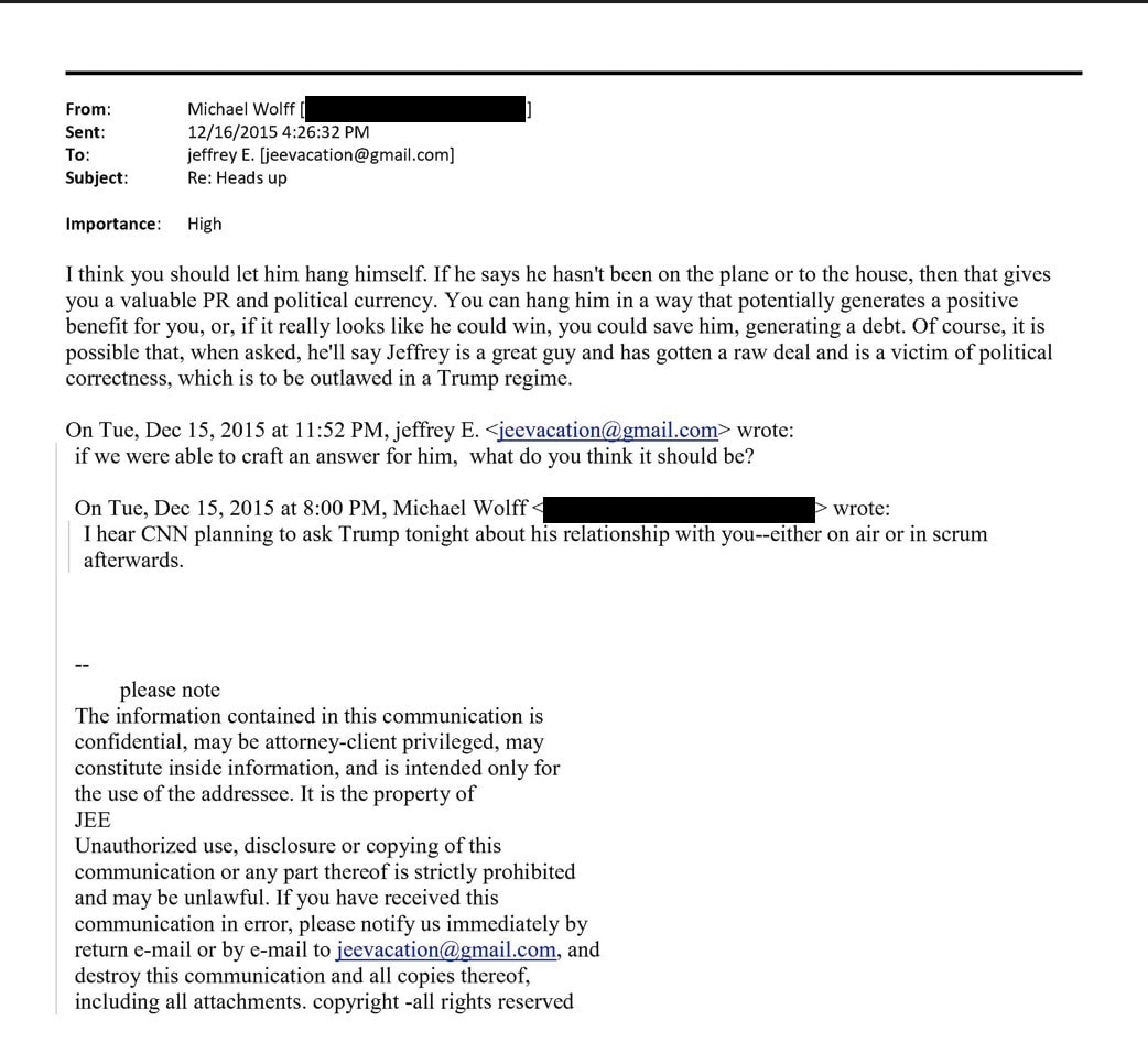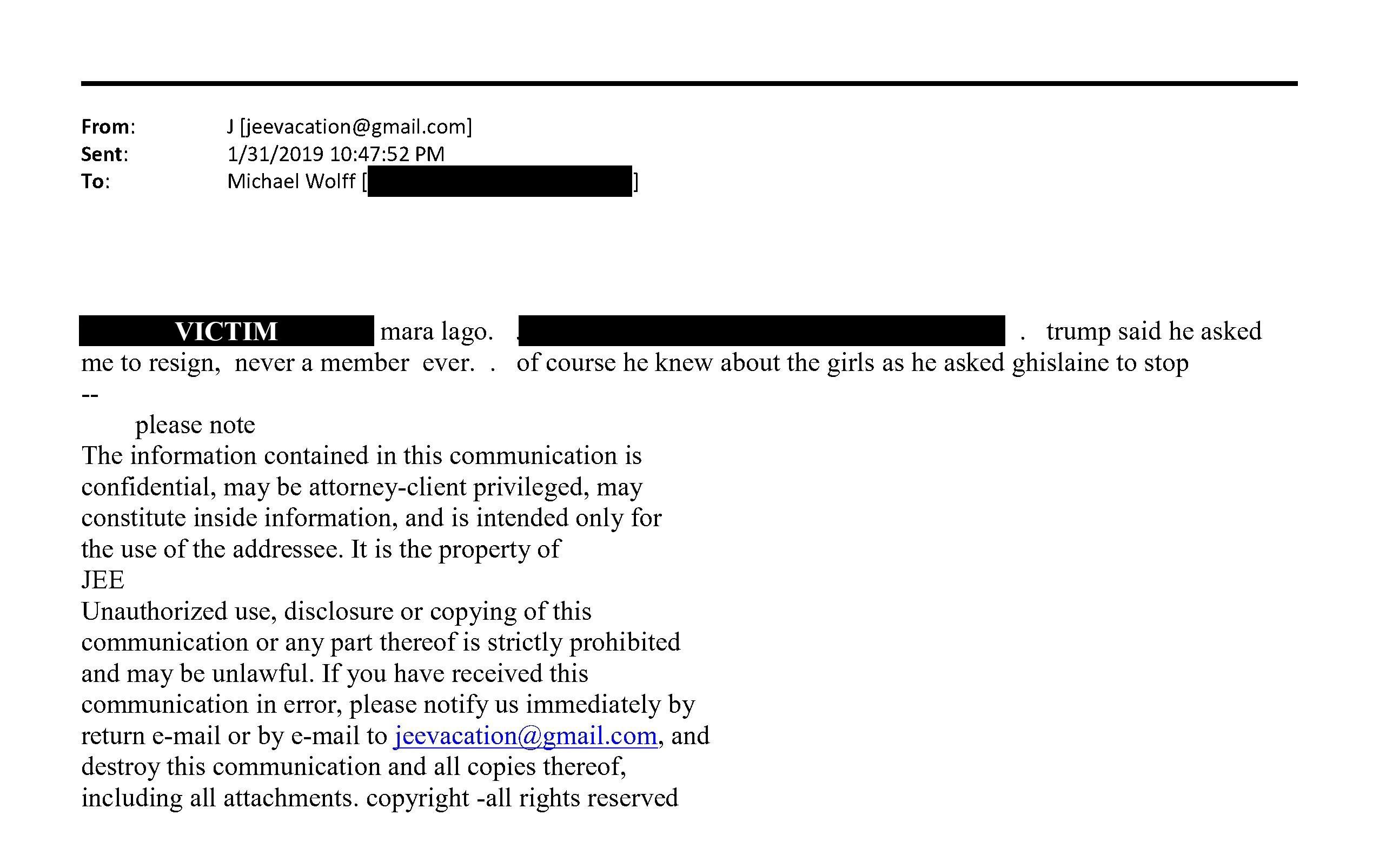 In another email to the author Michael Wolff, dated Jan 31, 2019, Epstein allegedly wrote: "Trump said he asked me to resign, never a member ever ... of course he knew about the girls as he asked Ghislaine to stop."