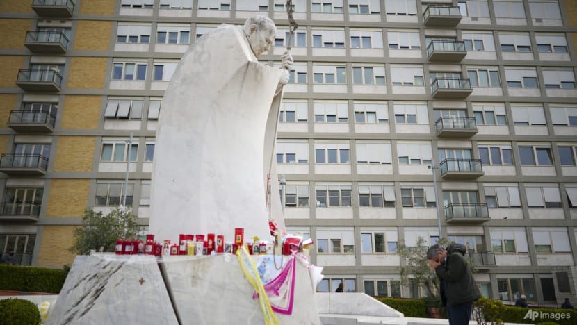 People gather near the statue of late Pope John Paul II outside Gemelli Hospital, where Pope Francis is admitted for treatment, in Rome, Italy, Mar 8, 2025. (Photo: Reuters)