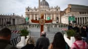 People left flowers and notes for Pope Francis, and lit candles at the base of the late pope's memorial.