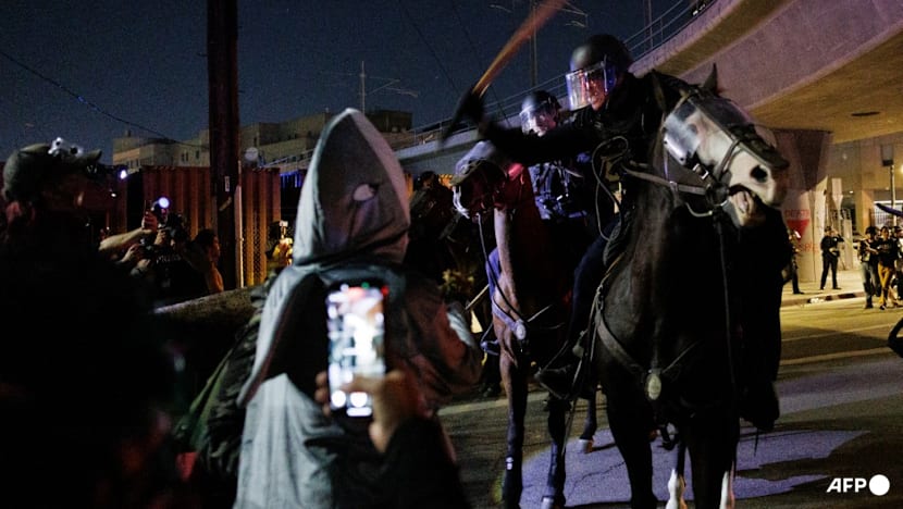 "After thousands of people gathered to express their constitutional 1st Amendment rights peacefully earlier in the day, nearly a hundred agitators marched over to Aliso and Alameda" where they used lasers and industrial-size flashing lights, the LAPD Central Division said on X.