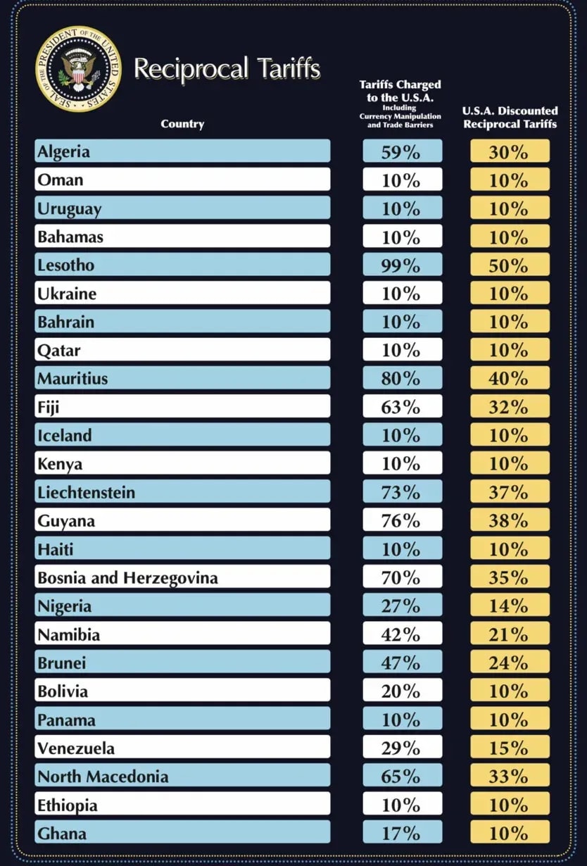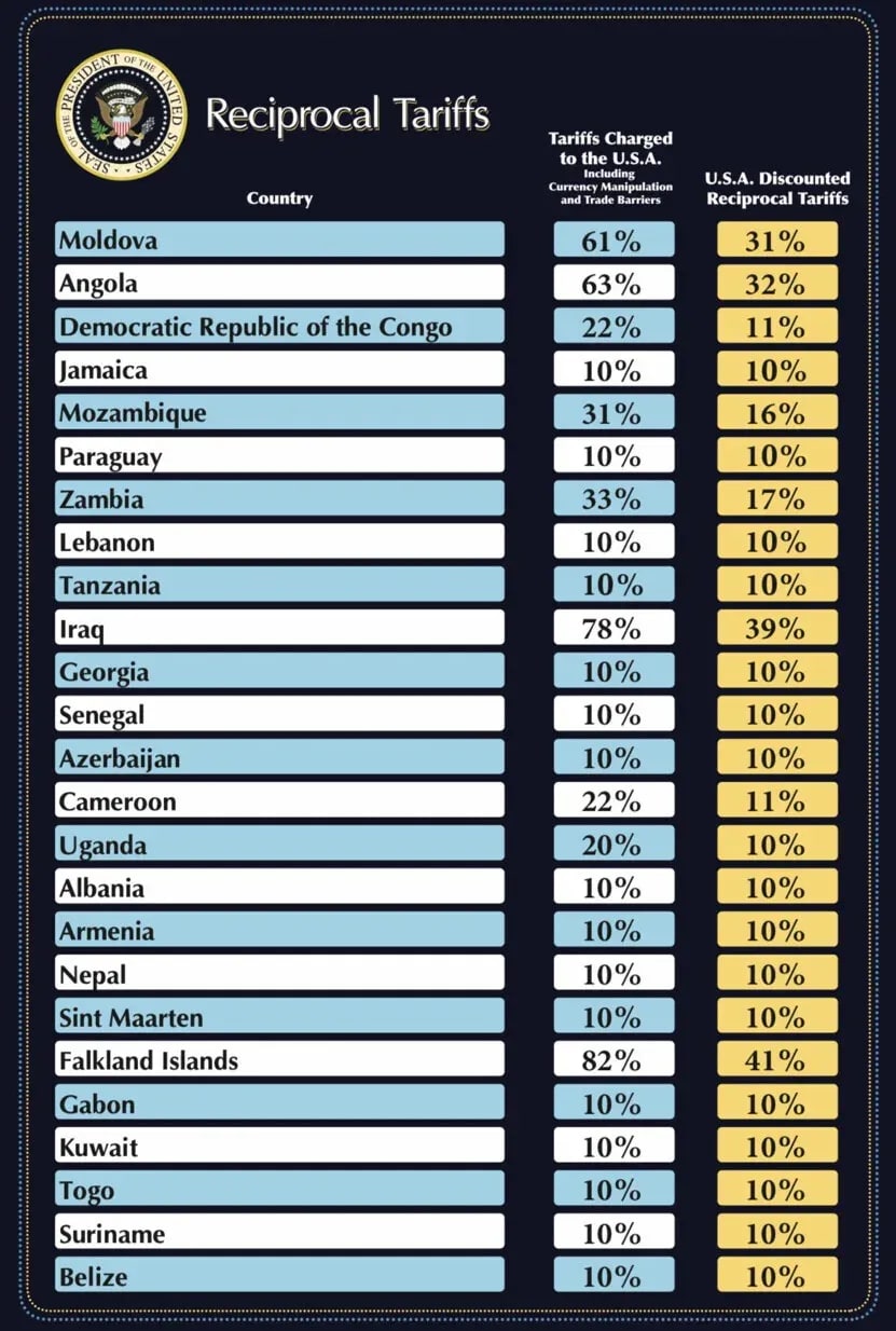 Among close U.S. allies, the European Union was targeted with a 20 per cent rate, Japan with 24 per cent, South Korea with 25 per cent and Taiwan with 32 per cent. Even some tiny territories and uninhabited islands in the Antarctic were hit by tariffs, according to a list posted by the White House on X.