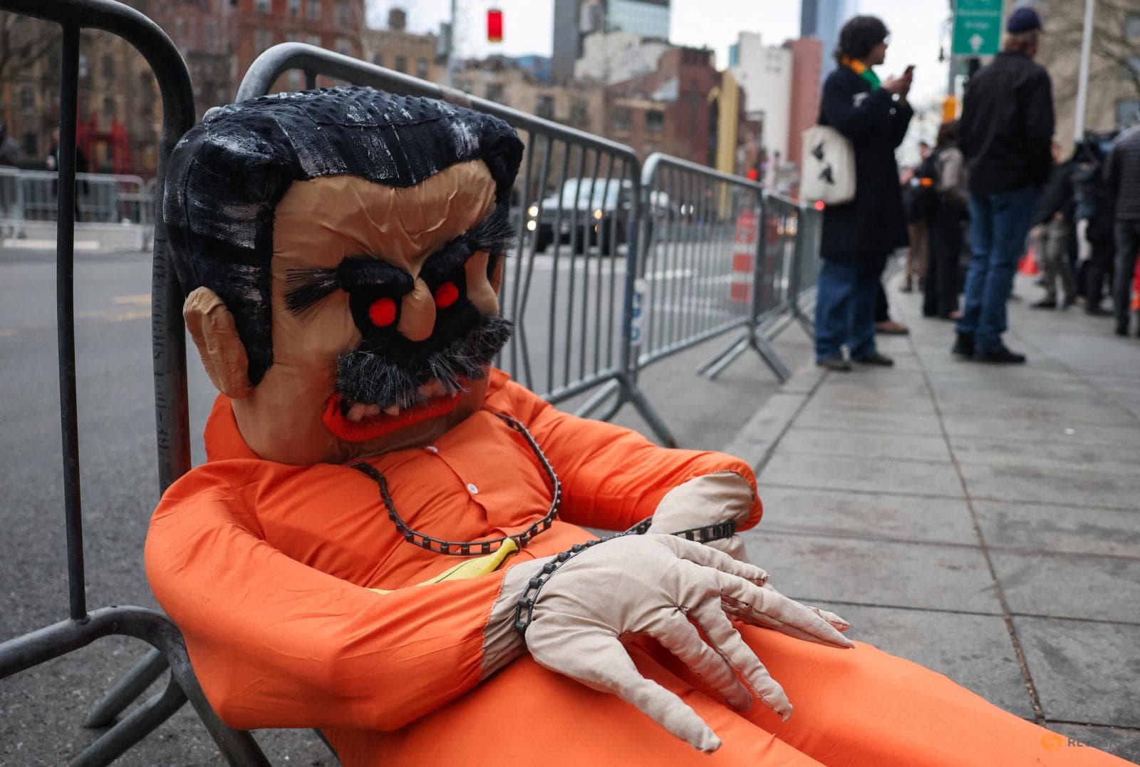Several backers and opponents of Maduro gathered outside the Manhattan courthouse, including some with a large inflatable doll depicting him in an orange prison jumpsuit with handcuffs.